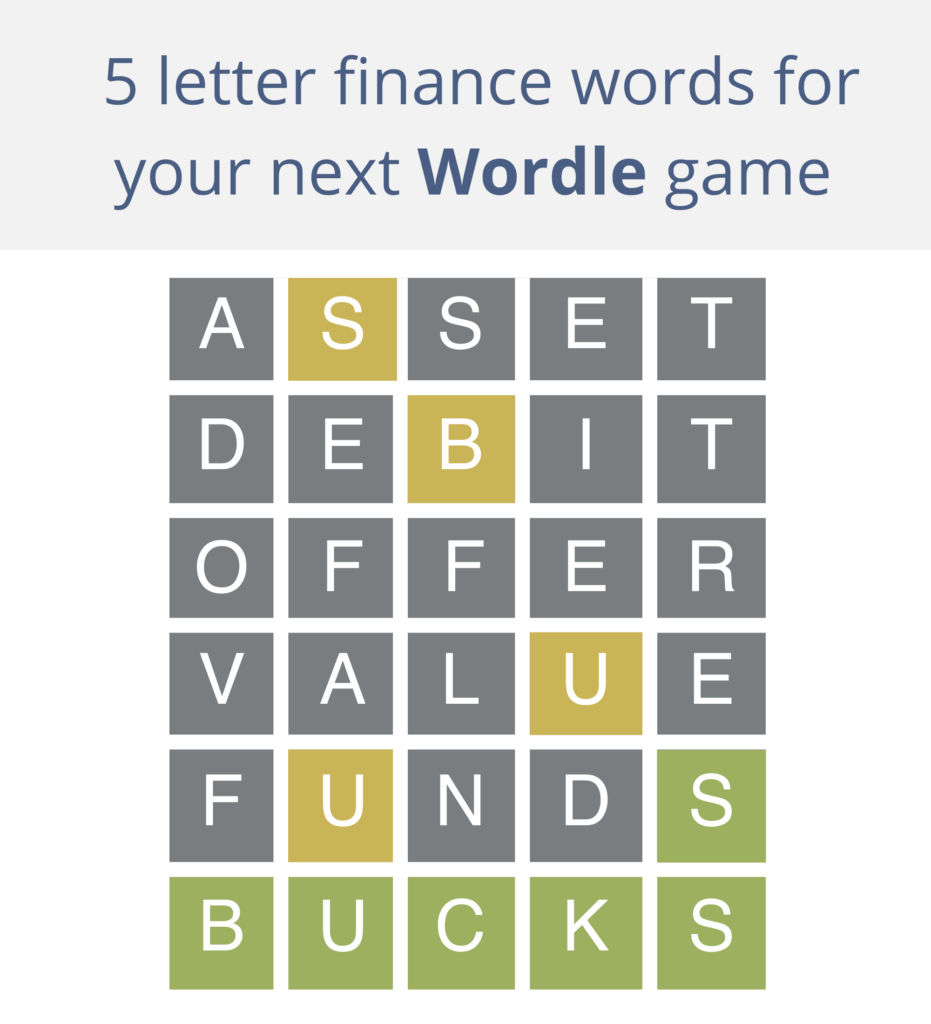 Much like snake or minesweeper (oops are we showing our age?!) why cheat yourself of such a simple and engaging guilty pleasure that is taking the world by storm. Although there is a simple way to “crack the code”, it really spoils the fun. So instead, we are going to give you a couple of 5 letter finance words to give you some inspiration for your next Wordle game.
